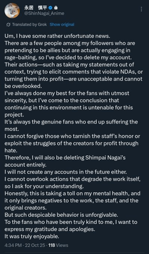 arrow-up160arrow-down1imageOne Punch Man S3 Director Shinpei Nagai deletes his twitter account due to the pressure, calls out people who took his tweets out of context/exploited the staff's struggles for "rage-baiting"external-preview.redd.italphacyberranger@sh.itjust.worksEnglish · 22 hours agomessage-square16linkfedilink