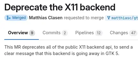 petsoi@discuss.tchncs.deM to Gnome@discuss.tchncs.de · 11 months agoGTK's X11 Backend Now Deprecated, Planned For Removal In GTK 5www.phoronix.comexternal-linkmessage-square0linkfedilinkarrow-up132arrow-down10cross-posted to: linux@lemmy.ml