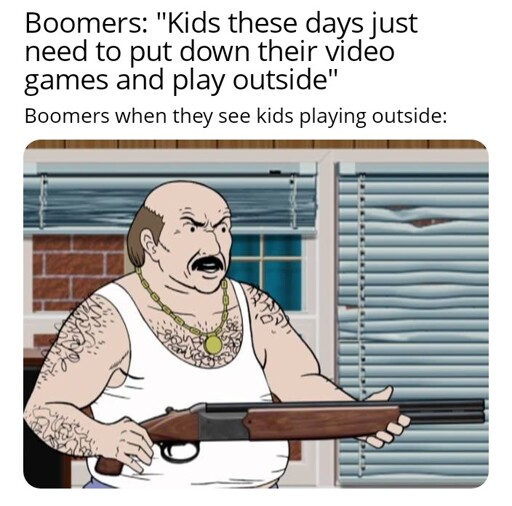 This is so freaking real. Some old folks seem to want that kids just stay still in silence like a furniture when they’re bored. No playing outside cuz “is annoying and dangerous”, not playing with their phones cuz “is unhealthy and dangerous”.