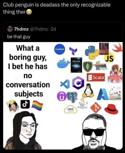 minus-squareasceticism@lemmy.worldlinkfedilinkarrow-up1·1 month agoIs the joke not self aware? I think it’s making fun of the guy for only being able to have tech related conversations. Like obviously it’s not Giggachad to only be able to talk about Linux.