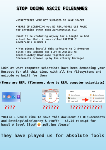 I remember hiding whacky wheels for DOS using ascii characters in the folder name. The professor tried to delete it using win 3.1… Hahahahaha… Good luck with that!