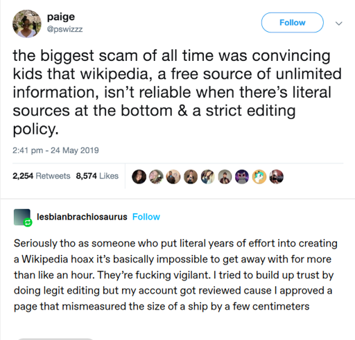 Right?! I’d rather have a bunch of autistic nerds patrolling their favorite subjects for stupid changes. Turns out that works pretty damned well.