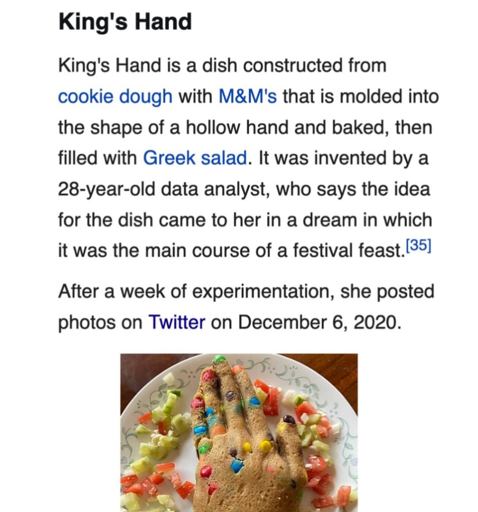 Up to that point, I was looking at the description in disbelief, but burst out laughing when I read “greek salad”. The hand cookie bit was just realistic enough to get it in the uncanny valley (the photo looked like an AI cookie hand, too… Actually, it might still be, I don’t know if that photo was from the lady that made them or added for the memenm, it says she produced photos in the meme… Really wish voyager’s comment UI showed more than just the one comment I’m replying to like RIF), but the greek salad put it well into absurd territory. Just imagining people biting into their over the top cookie thing and then making a wtf face at the combination of flavours in their mouth, though it would be even better if the initial surprise and disgust gets replaced by a confused look and then a “well played, not bad” because it works.