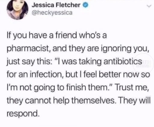 So a person should take the entire course of antibiotics that are prescribed to them. I guess I’m confused about why you said to the person who said you should take your entire course of antibiotics and not stop because of feelings is making false assumptions.
