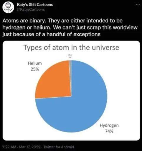 Edit to add: It’s even a bad interpretation of the metaphor. It’s like saying “akshually, there’s only two atomic particles, the proton and the electron, and these are the only two particles that determine charge, so there’s really only two types of atoms, positive and negative charged atoms, and that’s why black people don’t deserve civil rights.”