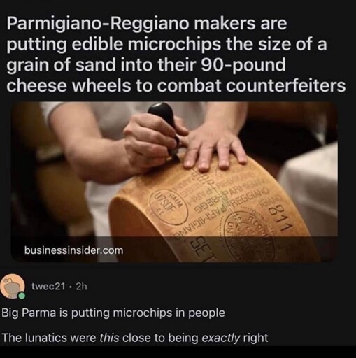 minus-squareNikelui@lemmy.worldlinkfedilinkarrow-up11·4 days agoIt’s probably something like an RFID tag that you can scan to check if the cheese is authentic.